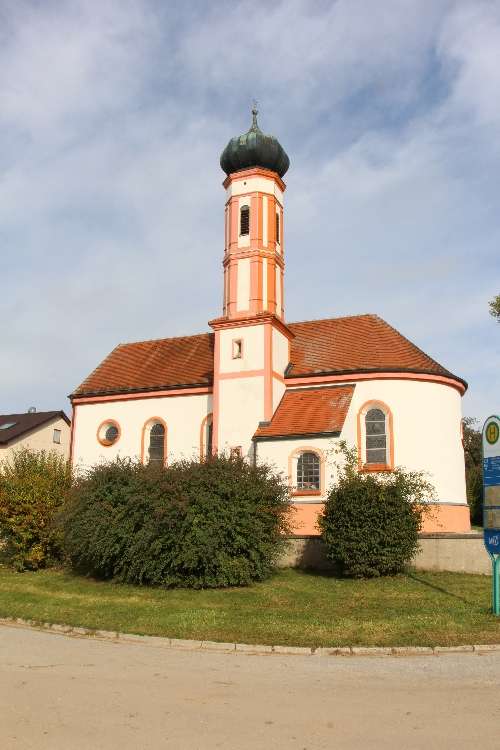 - abgestufter Sims und Dachziegel zwischen dem quadratischen Turmstumpf und dem achteckigen Schaft